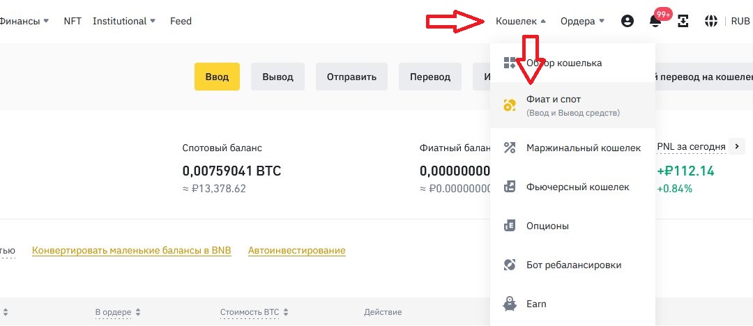 В личном кабинете заходим в раздел кошелек - фиат и спот