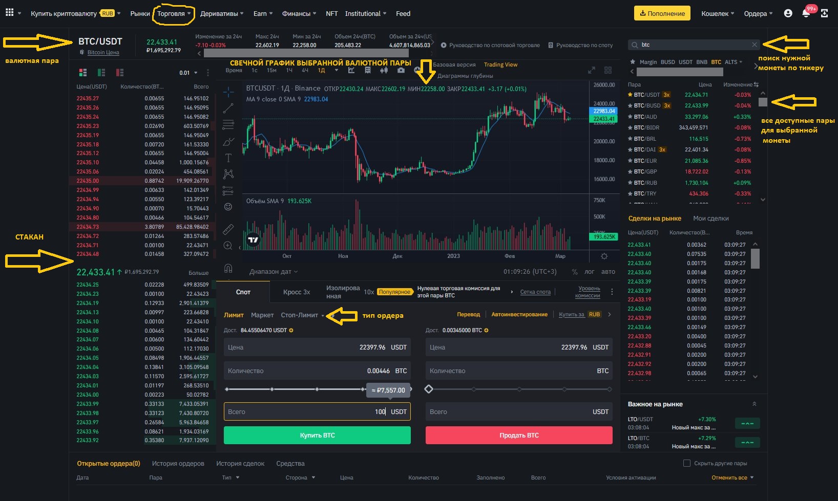 После выбора валютной пары, в середине экрана мы увидим её свечной график. Вещь полезная, но, если вы не занимаетесь техническим анализом и трейдингом, можете особо в него не вникать. Для покупки/продажи нас интересует окошко ниже графика во вкладке Спот. Тут мы выставляем ордер на покупку или продажу, ордера бывают разных типов, нас сейчас интересуют два: лимит и маркет. Лимитный ордер позволяет купить монету по заданной цене автоматически. К примеру, Вы считаете, что БитКоин будет стоить 21 000$, вы ставите лимитный ордер по этой цене, указываете количество монет, и, как только цена Биткоина дойдёт до заданной, ордер исполнится, и вы получите его на баланс. Аналогично и с продажей. К примеру, Вы купили какой-то альткоин (всё, что не биткоин)) в среднесрок с целью заработать на нём +50%. Вы можете сразу же поставить ордер на продажу по заданной цене, чтобы в будущем не забыть про эту вашу затею) Второй тип ордера маркет позволяет купить монеты по текущей рыночной цене, исполнится данный ордер моментально. Вот и всё, нчиего сложного, правда ведь? Можете немного попрактиковаться, уверен, освоитесь вы очень быстро.