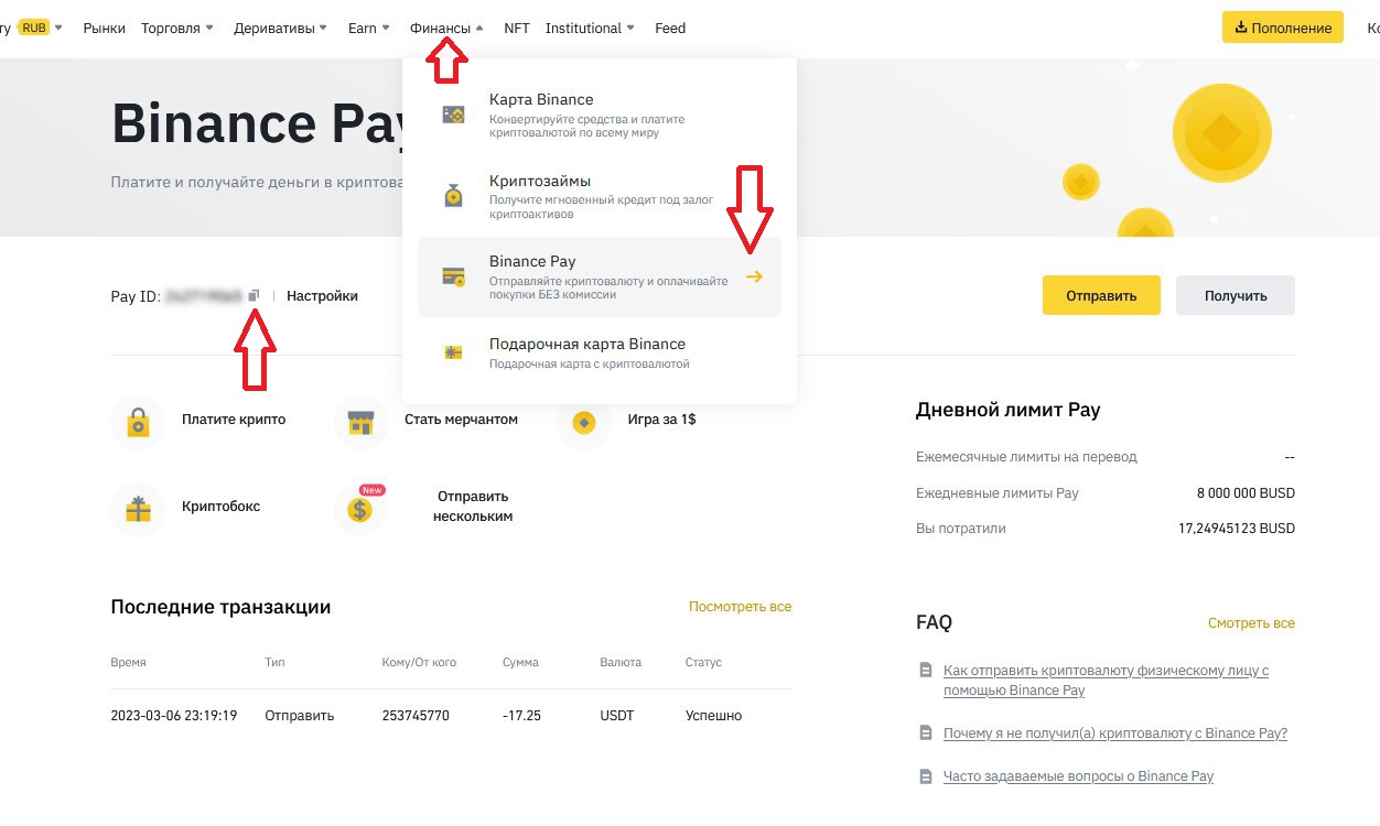 В верхнем меню выбираем финансы - Binance Pay. В открывшемся окне вы сразу же увидите, ваш Pay Id, который вы можете давать отправителю, для получения от него перевода. Правее есть жёлтая кнопка "отправить", необходимая для перевода средств другому получателю. В открывшемся окне вы сможете выбрать способ идентификация получателя (по номеру телефона, почте или pay id). Выбрать вид монеты и суммы, и, если у вас на балансе эта сумма имеется, перевести её. Все опять же интуитивно понятно, удобно, быстро и без комиссий) Мы не так давно стали использовать этот способ для отправки рефбеков в USDT.