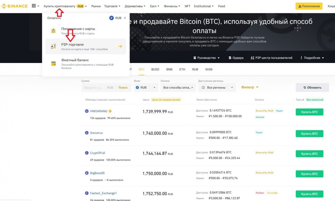 Второй отличный способ пополнения и вывода - это P2P торговля, которая позволяет пользователям торговать друг с другом напрямую. Биржа в данном случае выступает гарантом безопасности, поэтому риски мошенничества при данных операциях сведены практически к нулю. Покупать за фиат и продавать можно такие монеты как USDT, BTC, BUSD, BNB, ETH, SHIB. Также, с помощью этой функции можно пополнить свой рублёвый баланс и вывести его. При этом, в отличие от прямого ввода/вывода, в P2P список доступных способов оплаты выше: имеются карты различных банков (их список может со временем меняться из-за санкционной риторики), а также электронные кошельки вроде Perfect Money, Qiwi и других