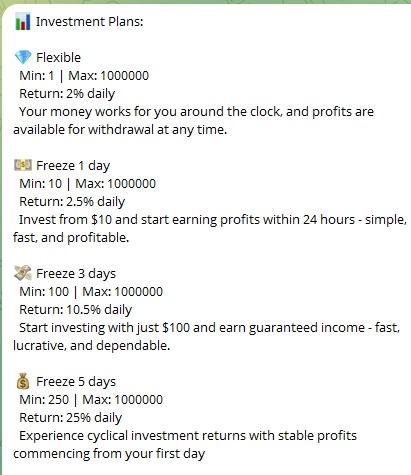 Доходность от +2 до +5% за 24 часа, начисления ежесекундные. Тело депозита замораживается на срок от 0 до 5 дней (зависит от тарифа) и затем доступно к выводу без дополнительных комиссий. Платёжные системы: USDT, USDC, BNB, TON, SOL, ETHEREUM