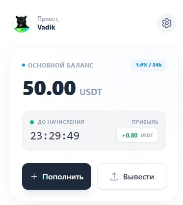 Доходность 1,6% ежедневно, тело депозита можно забрать в любое время с комиссией 5%. Платёжные системы: USDT в сетях ton, bep20 и sol.