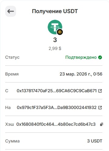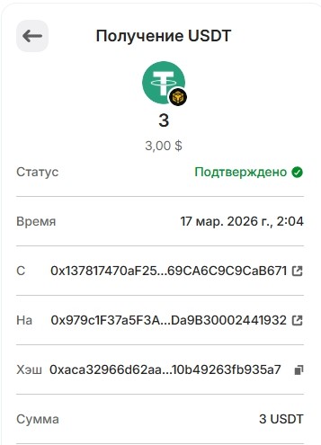 19.  1 USDT 16.03.2026 0x0f27596a34cca604b3f873e8778f6d01d933a4fc93d4ce4bed369b2242a28245