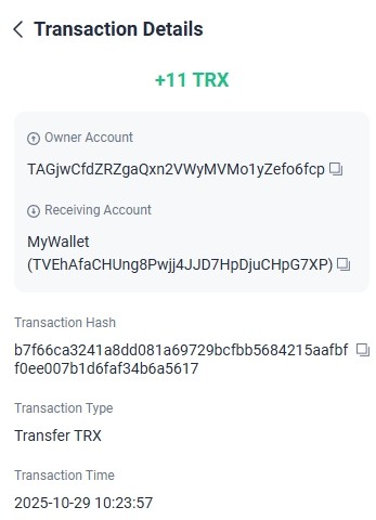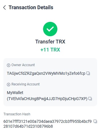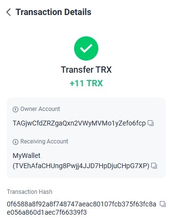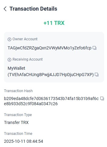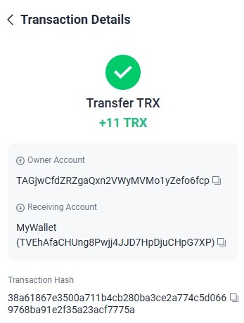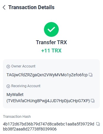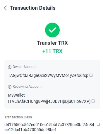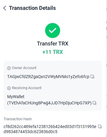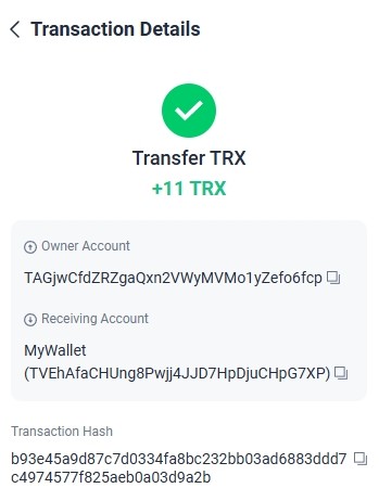 13. 11.000000 has been successfully sent to your Tron account TRXsGAfwxG****