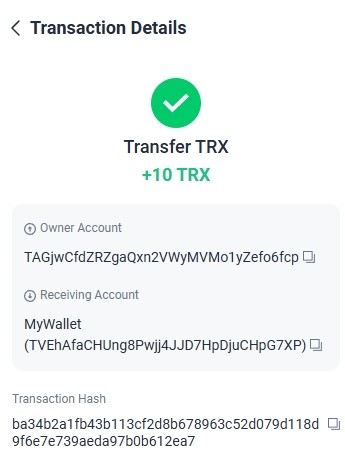 https://tronscan.org/#/transaction/7da661952fc4413672e58c071fd0f95f1cb241681108