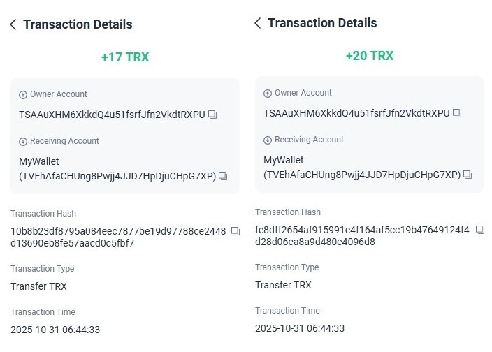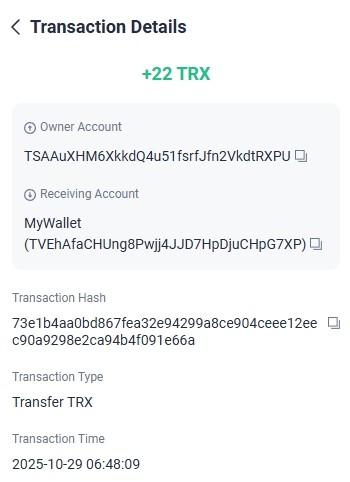 https://tronscan.org/#/transaction/2086fa8af8112e03f125521fabc05c6621b2dae359f5