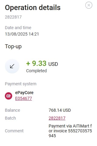 Примечание: Payment via AiTiMart for invoice 575731044755